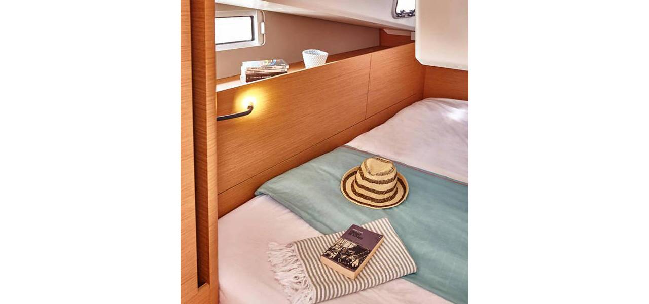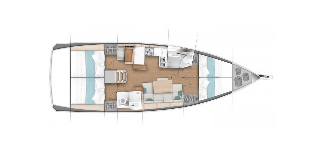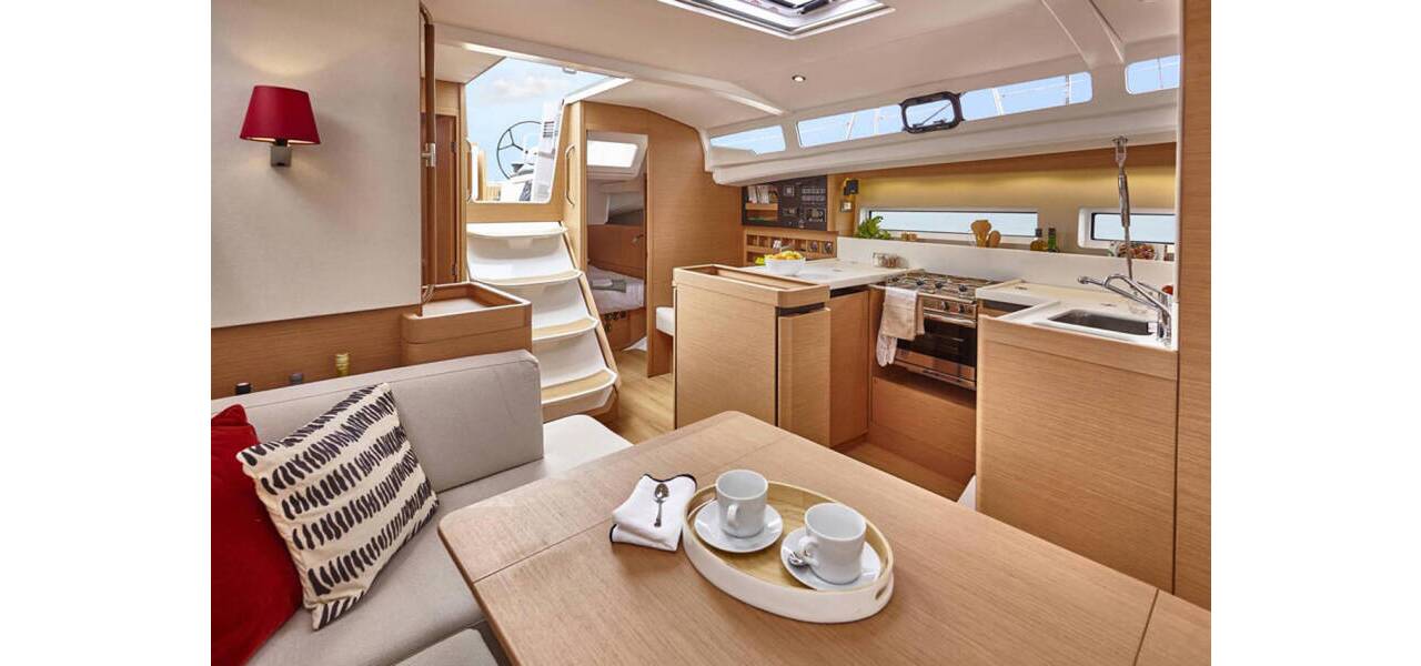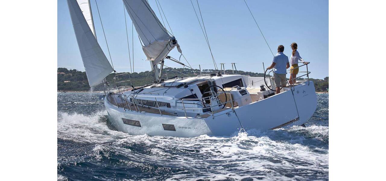 Segelyacht Sun Odyssey 440 Scorpio, aus 2023. Sie verfügt über 4 Kabinen und bietet Platz für 8 + 1 Personen bzw. verfügt über 2 Toiletten.