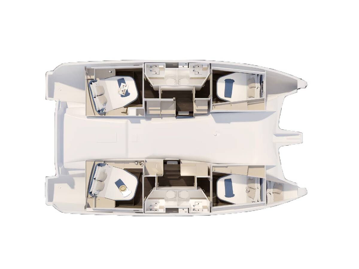 El Fountaine Pajot FP 41 Quatuor 4 „Auriga“ está equipado con una vela mayor y un génova , así como con un Bimini top, Piloto automático, Calefacción, GPS plotter plotter - cabina.
