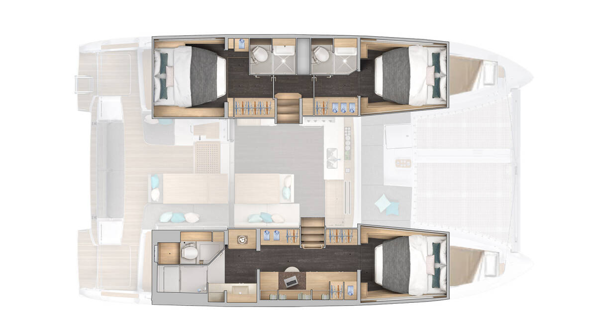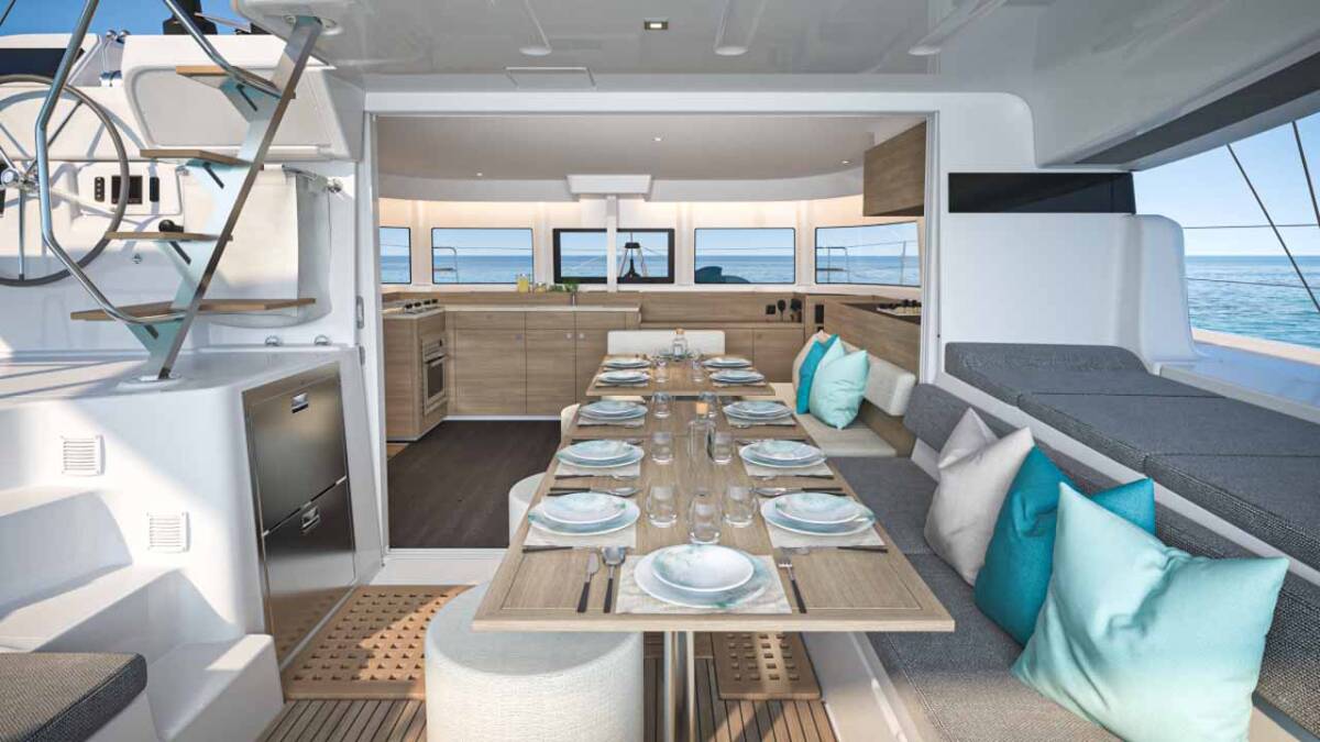 El Lagoon 43 „La Perla“ ofrece un confort especial con las siguientes características de equipamiento: Generador, Aire acondicionado, Cojines de bañera, Inversor, WC electrico, Paneles solares.